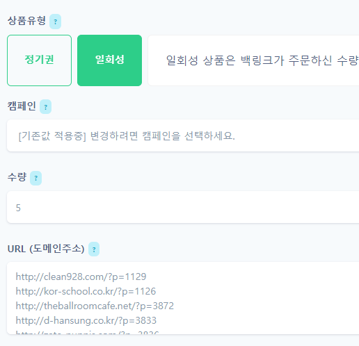 재작업 신청 버튼을 누르게 될 경우 기존 백링크 작업을 동일한 내용으로 신청할 수 있는 페이지로 이동됩니다.