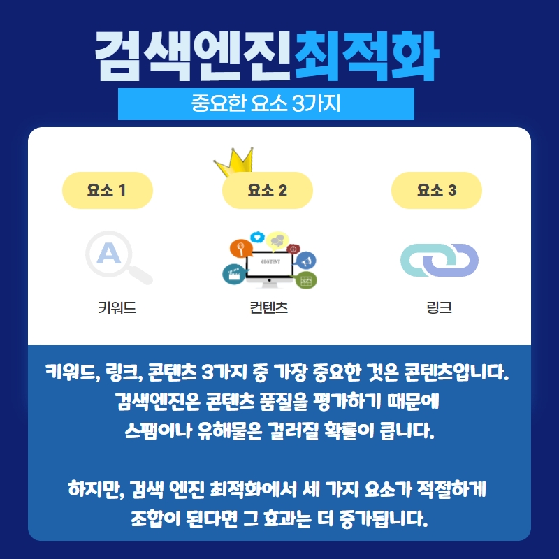 검색엔진최적화의 중요한 3요소로는 키워드, 컨텐츠, 링크가 있습니다.