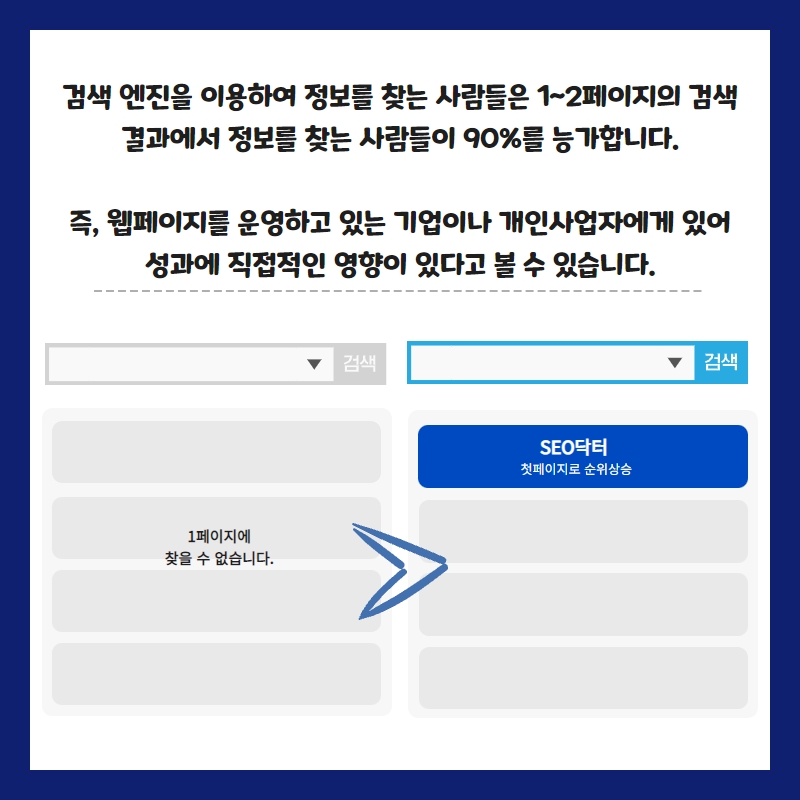 그리하여 검색 결과 1페이지에 운영하고 계시는 웹사이트를 자리 선점을 하신다면 매출의 직접적인 성과에 영향이 있다고 볼 수 있습니다.