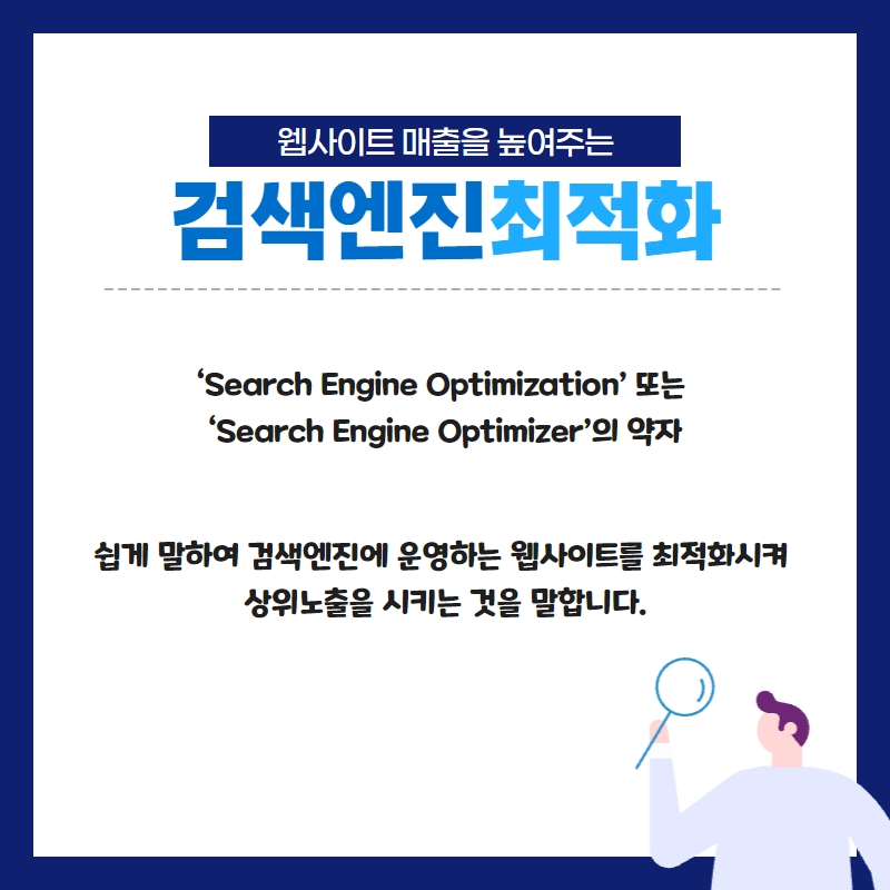 사이트 내의 메타 태그나 키워드, 컨텐츠 등을 검색 엔진이 이해하기 쉽게 최적화하여 운영하는 웹사이트를 검색 결과에 상위에 노출되게 하는 작업입니다.