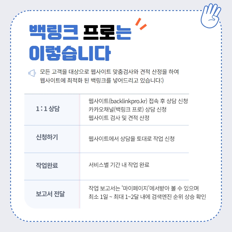 '백링크 프로'에서는 1:1 상담과 함께 간단한 신청과 작업 완료 후 투명성 있게 보고서를 전달해드리는 단계로 진행되고 있습니다.