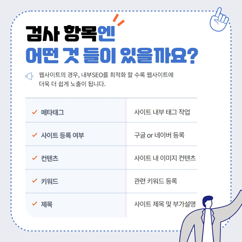 웹사이트의 경우, 내/외부 SEO가 있습니다. 내부 SEO작업이 잘 되어있는 경우, 검색엔진에 좋은 점수를 받아 높은 순위에 위치할 수 있습니다. 그럼 간단하게 내부 SEO에는 무엇을 포함하고 있는지 알려드리도록 하겠습니다. 첫 번째로 메타태그입니다. 메타태그에는 사이트의 키워드나 사이트의 등록 여부 그리고 부제목 같은 부분이 포함되어 있습니다. 사이트의 등록 여부는 '네이버 서치 어드바이저' 혹은 '구글 서치 콘솔'에 등록이 되어있는지를 나타내 주는 부분입니다. 두 번째로는 콘텐츠 부분입니다. 웹사이트 내에는 많은 콘텐츠들이 포함되어 있습니다. 우리가 책을 살 때에도 내부에 콘텐츠적인 요소가 양질적인 면에서 좋으면 구매를 하듯이 웹사이트 또한 내부에 양칠의 콘텐츠가 있으면 더 좋은 점수를 부여받을 수 있습니다. 세번째로는 제목입니다. 제목에 관련된 키워드가 얼마나 포함되어 있는지와 여러 유저들의 첫인상이 되는 부분이기에 중요한 요소라고 볼 수 있습니다.