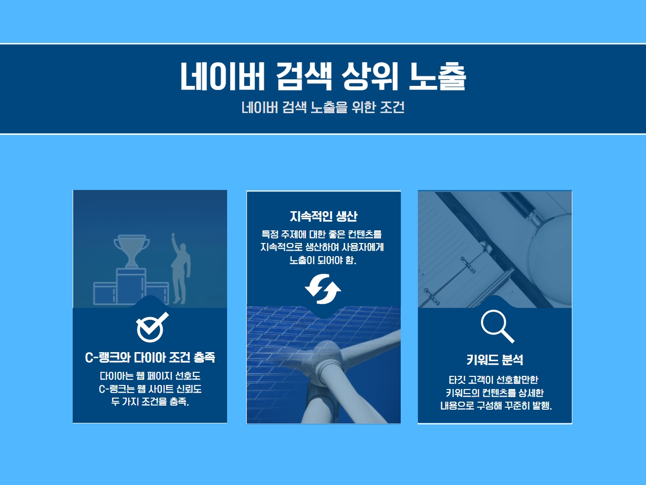 그리고 콘텐츠의 지속적인 생산입니다. 특정 주제에 대한 좋은 콘텐츠를 지속적으로 생산하여 검색 사용자에게 인정받아 활용되어야만 네이버 상위 랭킹이 가능한 방향으로 발전합니다.